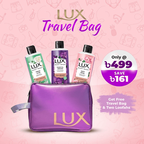 লাক্স বডি ওয়াশের ফ্রেশনেসে ত্বক হবে কোমল, মসৃণ ও উজ্জ্বল। এলোভেরা, ব্ল্যাক অর্কিড ও ফ্রেঞ্চ রোজ -এর কম্বো অফারে এখন এই তিনটি ভ্যারিয়েন্ট দারাজে কিনলেই পাচ্ছেন ফ্রি ট্রাভেল ব্যাগ।