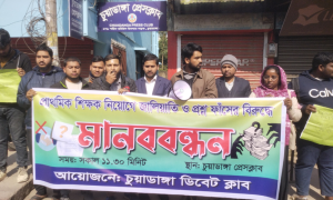 চুয়াডাঙ্গা: চুয়াডাঙ্গায় প্রাথমিক শিক্ষক নিয়োগে জালিয়াতি ও প্রশ্নপত্র ফাঁসের বিরুদ্ধে পাঁচ দফা দাবিতে মানববন্ধন কর্মসূচি পালন করেছে ডিবেট ক্লাব। রোববার (১১ জানুয়ারী) দুপুরে চুয়াডাঙ্গা প্রেসক্লাবের সামনে এ মানববন্ধন কর্মসূচি পালন […]