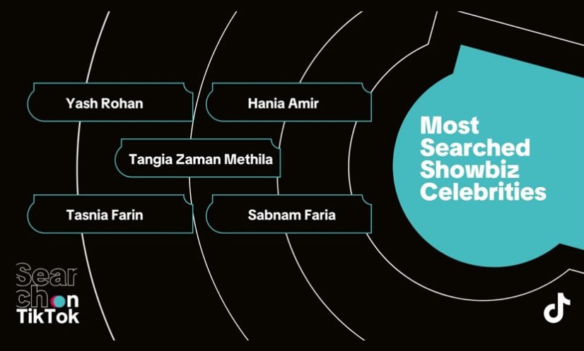 ২০২৫ সালে বাংলাদেশে টিকটকে সবচেয়ে বেশি সার্চ হওয়া শোবিজ তারকার মধ্যে ছিলেন ইয়াশ রোহান, হানিয়া আমির, তানজিয়া জামান মিথিলা, তাসনিয়া ফারিন এবং শবনম ফারিয়া। সবচেয়ে বেশি সার্চ হওয়া সংগীতশিল্পীদের মধ্যে ছিলেন রিয়াদ আহসান, তালউইন্দার, লালন ব্যান্ড সুমি, প্রীতম হাসান এবং টেইলর সুইফট।