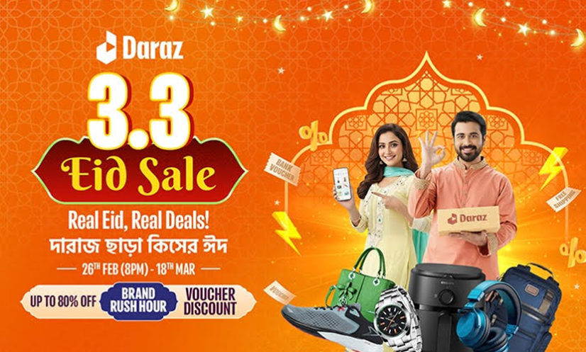 ঢাকা: দেশের অনলাইন মার্কেটপ্লেস দারাজ বাংলাদেশ ‘রিয়েল ঈদ, রিয়েল ডিলস’ নামে শুরু করেছে ‘৩.৩ ঈদ সেল’ ক্যাম্পেইন। ঈদকে সামনে রেখে গ্রাহকদের কেনাকাটায় বাড়তি আনন্দ যোগাতে এই উৎসব চলবে আগামী ১৮ মার্চ পর্যন্ত। এতে ক্রেতারা পাচ্ছেন আকর্ষণীয় সব ডিল, নামী ব্র্যান্ডগুলোর সঙ্গে বিশেষ কোলাবরেশন এবং পেমেন্ট পার্টনারদের মাধ্যমে নিশ্চিত সাশ্রয়ের দারুণ সুযোগ।