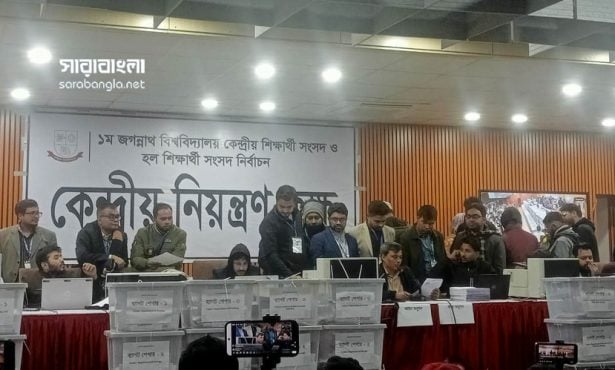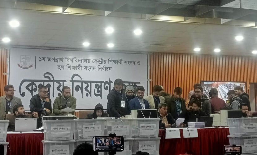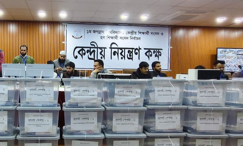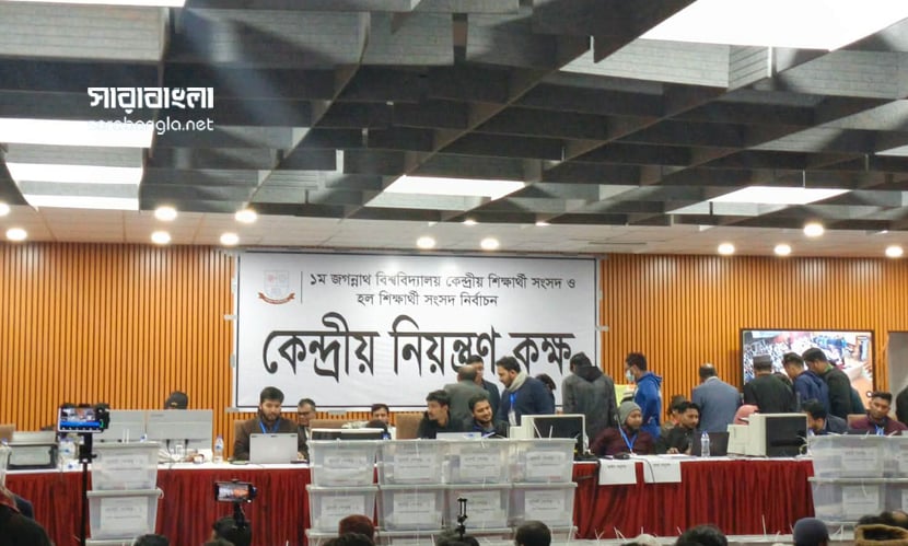 জগন্নাথ বিশ্ববিদ্যালয়ের কেন্দ্রীয় অডিটোরিয়ামে স্থাপিত নির্বাচনের কেন্দ্রীয় নিয়ন্ত্রণ কক্ষে ফলাফল ঘোষণা চলছে।