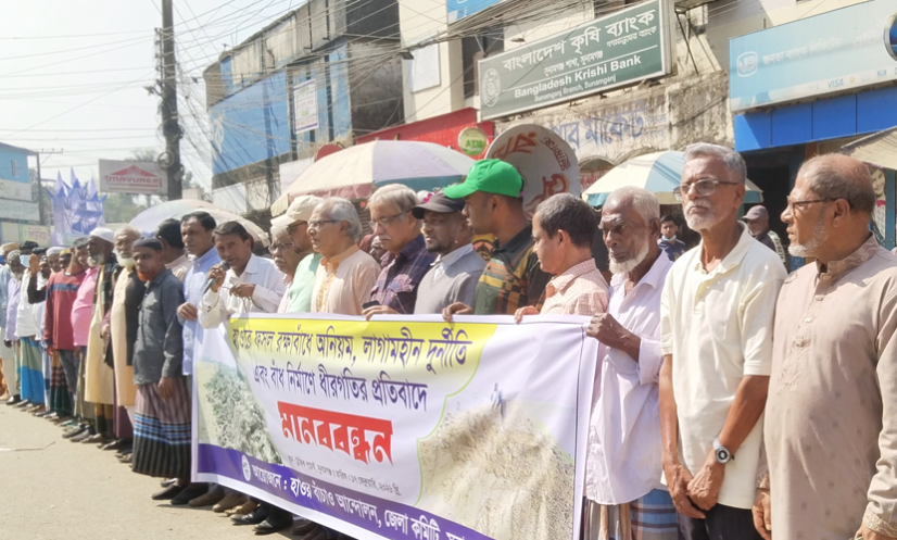 সুনামগঞ্জ: হাওড়ে ফসল রক্ষার উদ্দেশ্যে নেওয়া বাঁধ নির্মাণ প্রকল্পে অনিয়ম ও দুর্নীতি এবং নির্মাণে ধীরগতির প্রতিবাদে সুনামগঞ্জে মানববন্ধন অনুষ্ঠিত হয়েছে।
