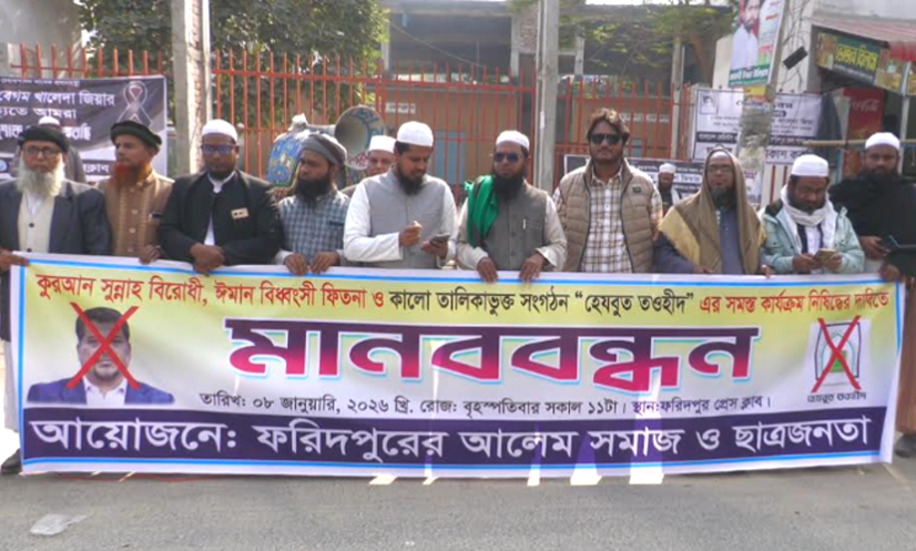 ফরিদপুর: কুরআন সুন্নাহ বিরোধী, ঈমান বিধ্বংসী ফিতনা ও কালো তালিকাভূক্ত সংগঠন হেযবুত তওহীদ-এর সমস্ত কার্যক্রম নিষিদ্ধের দাবিতে ফরিদপুরে মানববন্ধন কর্মসূচি পালন করেছে আলেম সমাজ ও ছাত্রজনতা।