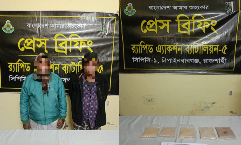চাঁপাইনবাবগঞ্জ: চাঁপাইনবাবগঞ্জের সদর থানা এলাকায় পৃথক অভিযানে অর্ধকোটি টাকা মূল্যের হেরোইন জব্দ ও দুই চিহ্নিত মাদক কারবারিকে গ্রেফতার করেছে র্যাপিড অ্যাকশন ব্যাটালিয়ন (র্যাব)।