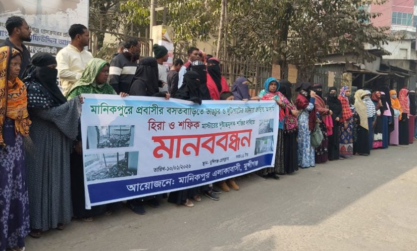 শনিবার (১০ জানুয়ারি) সকাল ১১টায় মুন্সীগঞ্জ প্রেসক্লাবের সামনে স্থানীয় এলাকাবাসীর ব্যানারে এ কর্মসূচি পালিত হয়। মানববন্ধনে প্রায় দেড় শতাধিক নারী-পুরুষ অংশ নেন।