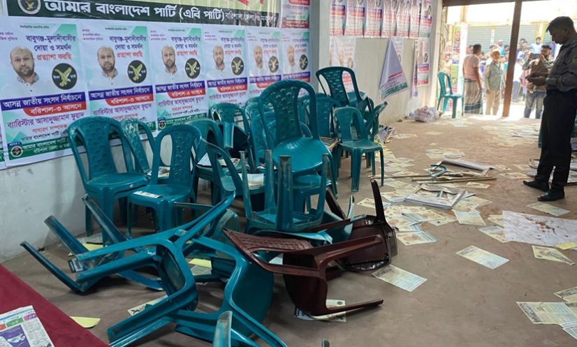 বরিশাল: বরিশালের বাবুগঞ্জে আমার বাংলাদেশ (এবি) পার্টির নির্বাচনি কার্যালয় ভাঙচুরের ঘটনা ঘটেছে অভিযোগ উঠেছে। এ ঘটনায় দলের সাধারণ সম্পাদক ও ১১ দলীয় জোটের প্রার্থী ব্যারিস্টার আসাদুজ্জামান ফুয়াদ থানায় অভিযোগ করেছেন।