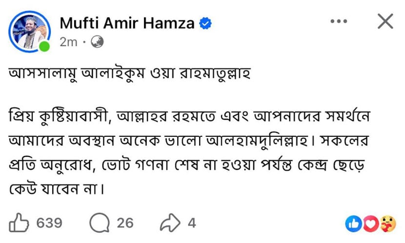 ফেসবুক পোস্টে তিনি লিখেছেন, ‘আসসালামু আলাইকুম ওয়া রাহমাতুল্লাহ। প্রিয় কুষ্টিয়াবাসী, আল্লাহর রহমতে এবং আপনাদের সমর্থনে আমাদের অবস্থান অনেক ভালো আলহামদুলিল্লাহ। সকলের প্রতি অনুরোধ, ভোট গণনা শেষ না হওয়া পর্যন্ত কেন্দ্র ছেড়ে কেউ যাবেন না।’