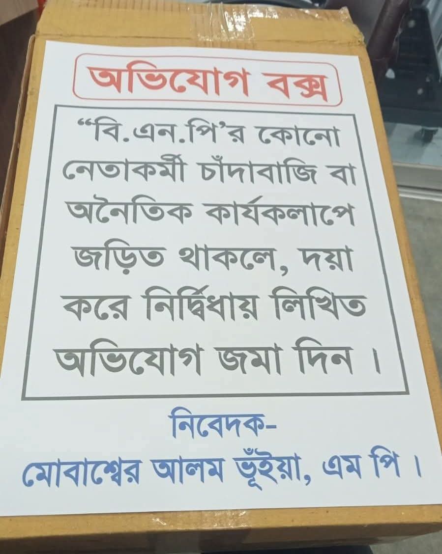 অভিযোগ বক্সে লেখা রয়েছে, ‘বিএনপি’র কোনো নেতাকর্মী চাঁদাবাজি বা অনৈতিক কার্যকলাপে জড়িত থাকলে, দয়া করে নির্ভয়ে লিখিত অভিযোগ জমা দিন।’ নিবেদক- মোবাশ্বের আলম ভূঁইয়া, এমপি।