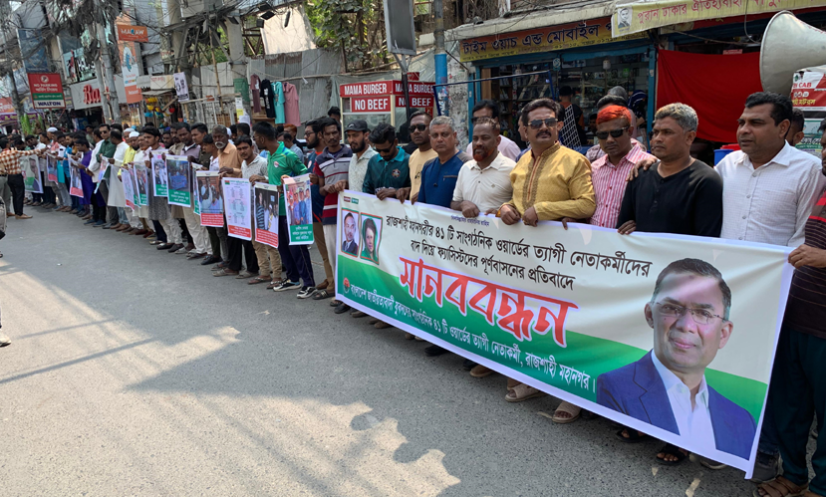 রাজশাহী: রাজশাহী মহানগরীর ৪১টি সাংগঠনিক ওয়ার্ডের ত্যাগী নেতাকর্মীদের বাদ দিয়ে টাকার বিনিময়ে ‘ফ্যাসিস্টদের পুনর্বাসন’র অভিযোগে মানববন্ধন করেছেন বিএনপির পদ বঞ্চিত নেতাকর্মীরা।