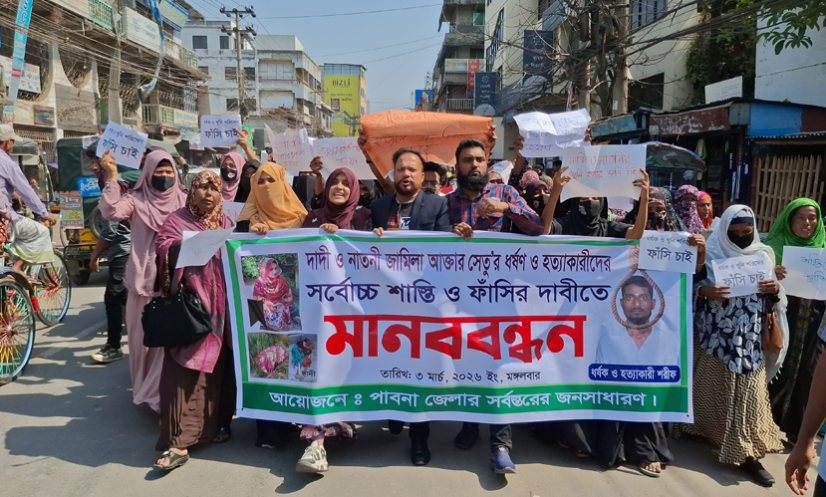 পাবনা: পাবনার ঈশ্বরদীতে মধ্যরাতে দাদিকে হত্যা করে বাড়ি থেকে নাতনিকে অপহরণ করে ধর্ষণ ও হত্যার প্রতিবাদে এবং ফাঁসির দাবিতে মানববন্ধন ও বিক্ষোভ অনুষ্ঠিত হয়েছে।