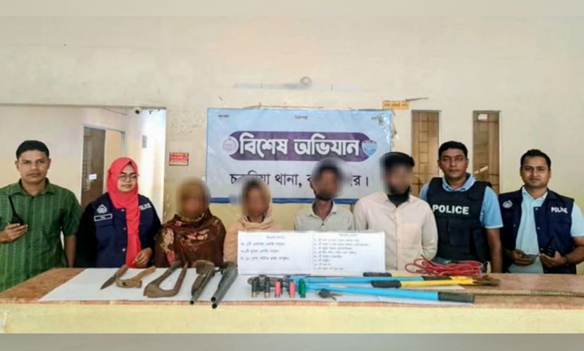 কক্সবাজার: আসন্ন ঈদুল ফিতরকে সামনে রেখে নিরাপত্তা জোরদারের অংশ হিসেবে কক্সবাজারের চকরিয়ায় বিশেষ অভিযান চালিয়ে ডাকাতির প্রস্তুতিকালে চারজনকে গ্রেফতার করেছে পুলিশ। এ সময় তাদের কাছ থেকে বিপুল পরিমাণ অস্ত্র ও ডাকাতির সরঞ্জাম জব্দ করা হয়েছে বলে জানিয়েছে পুলিশ।