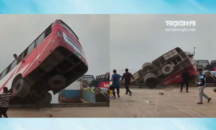 রাজবাড়ী: রাজবাড়ীর দৌলতদিয়া ঘাটে ফেরিতে ওঠার সময় যাত্রীবাহী একটি বাস উলটে নদীতে পড়ে গেছে।
