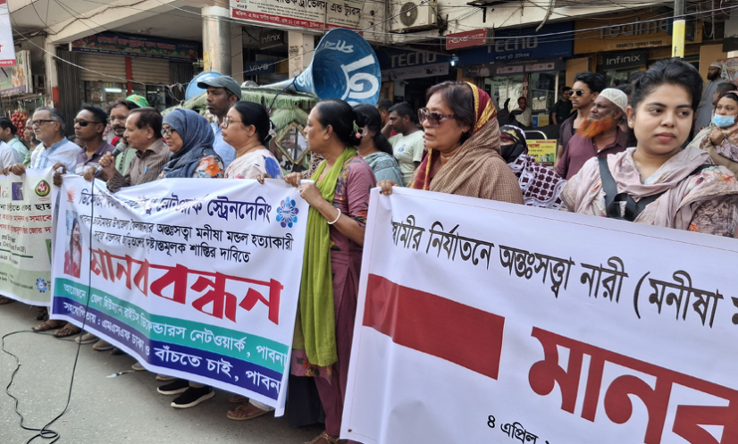পাবনা: পাবনার চাটমোহরে স্বামীর নির্যাতনে তিন মাসের অন্তঃসত্ত্বা গৃহবধূ মনীষা মণ্ডলের মৃত্যুর অভিযোগ ওঠার পর এ ঘটনার প্রতিবাদে ও দোষীদের শাস্তির দাবিতে মানববন্ধন কর্মসূচি পালিত হয়েছে।