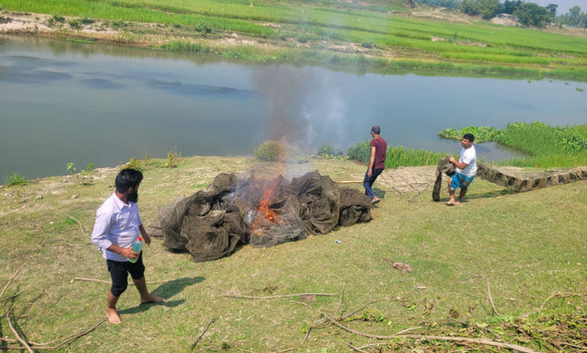 অবৈধ জাল ধ্বংস করা হচ্ছে।