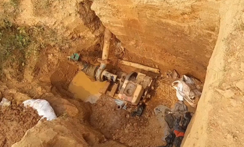 গভীর গর্তে শ্যালো বসিয়ে সেচ দিচ্ছেন কৃষকেরা।