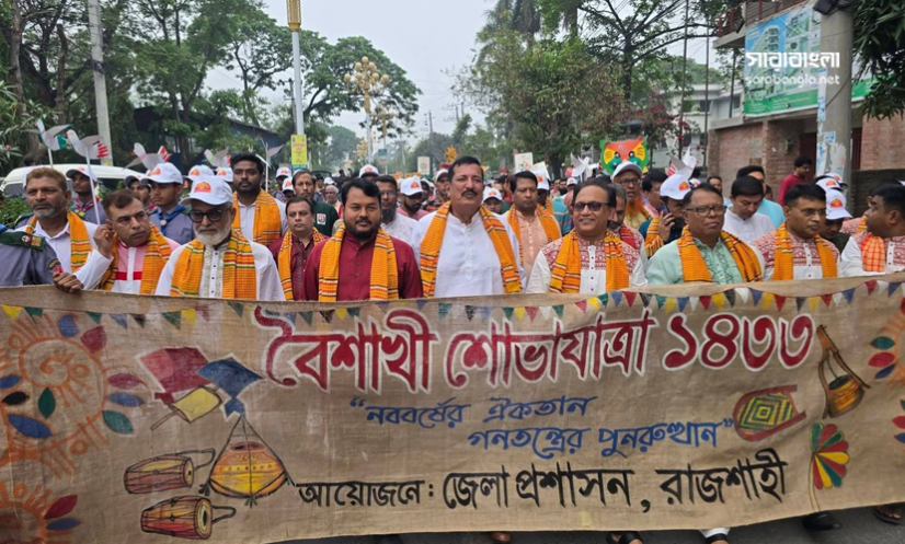 রাজশাহী: ‘নববর্ষের ঐক্যতান, গণতন্ত্রের পুনরুত্থান’— এই স্লোগানকে সামনে রেখে বর্ণাঢ্য শোভাযাত্রা ও নানা কর্মসূচির মধ্য দিয়ে রাজশাহীতে উদযাপিত হচ্ছে পহেলা বৈশাখ ১৪৩৩। রাজশাহী জেলা প্রশাসনের উদ্যোগে উৎসবমুখর পরিবেশে এই বর্ষবরণ অনুষ্ঠানের আয়োজন করা হয়।