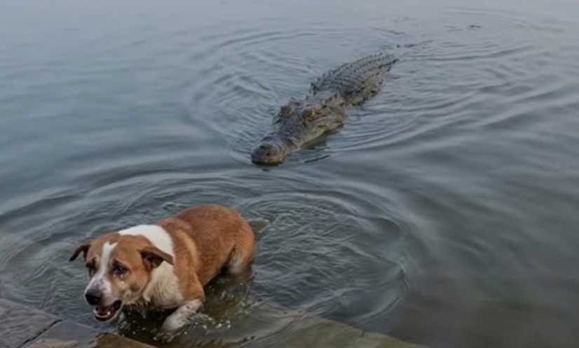 কুকুরকে কুমিরের টেনে নিয়ে যাওয়ার সেই দৃশ্য।
