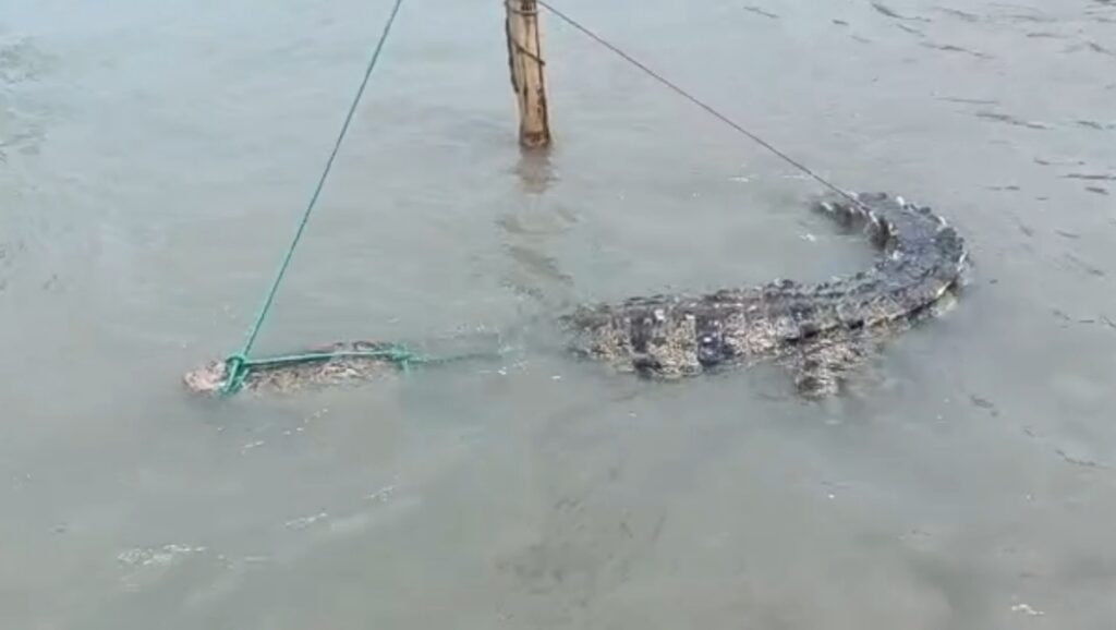 সোমবার (২৭ এপ্রিল) সকাল ৭টার দিকে চরভদ্রাসন উপজেলার গোপালপুর চর এলাকায় পদ্মা নদীতে জেলে স্বপন ব্যাপারীর পাঁচ হাজারি বড়শিতে (হাজারি বড়শি হলো মাছ ধরার একটি বিশেষ ও প্রাচীন পদ্ধতি, যেখানে একটি শক্ত ও দীর্ঘ দড়িতে অনেকগুলো বা হাজার বা অনেক বেশি ছোট ছোট বড়শি এক সাথে বেধে জলাশয়ে পাতা হয়) কুমিরটি জড়িয়ে যায়। এসময় স্বপন ব্যাপারী এবং তার দুই ছেলে রাজিব ব্যাপারী ও রবিউল ব্যাপারীসহ পাঁচ জন কুমিরটিকে উদ্ধার করে নদীর পাড়ে নিয়ে আসে।