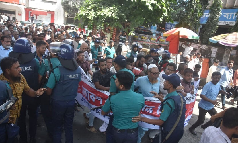 চট্টগ্রাম ব্যুরো: মিছিল-সমাবেশের ওপর পুলিশের নিষেধাজ্ঞা উপক্ষো করে চট্টগ্রাম বন্দর ভবন অভিমুখে বিক্ষোভ মিছিল বের করেছিল শ্রমিক-কর্মচারী ঐক্য পরিষদ (স্কপ)। তবে পুলিশের বাধায় তারা বন্দর ভবন পর্যন্ত যেতে পারেনি। পুলিশের সঙ্গে বাগ্বিতণ্ডা পর সংগঠনটি আগামী ১ নভেম্বর ‘শ্রমিক অনশনের’ ডাক দিয়ে সর্বস্তরের জনতাকে এ আন্দোলনে শরিক হবার আহ্বান জানায়।