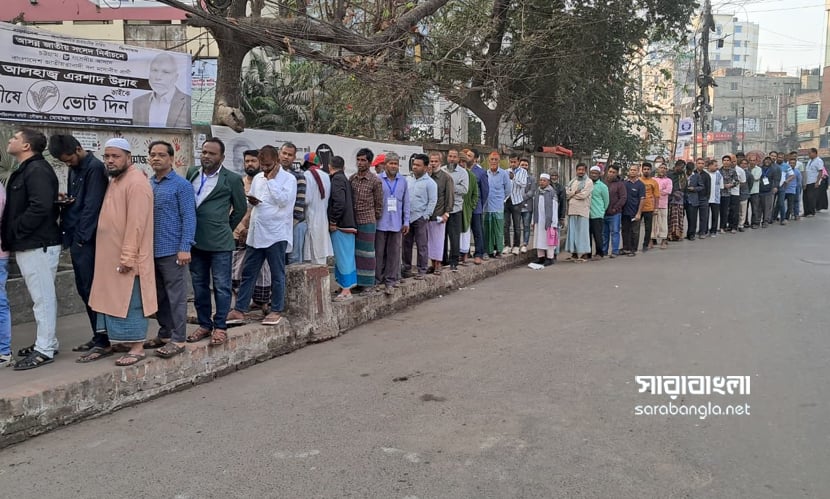 ভোট কেন্দ্রের বাইরে লাইনে দাঁড়িয়ে আছেন ভোটাররা। ছবি: সারাবাংলা