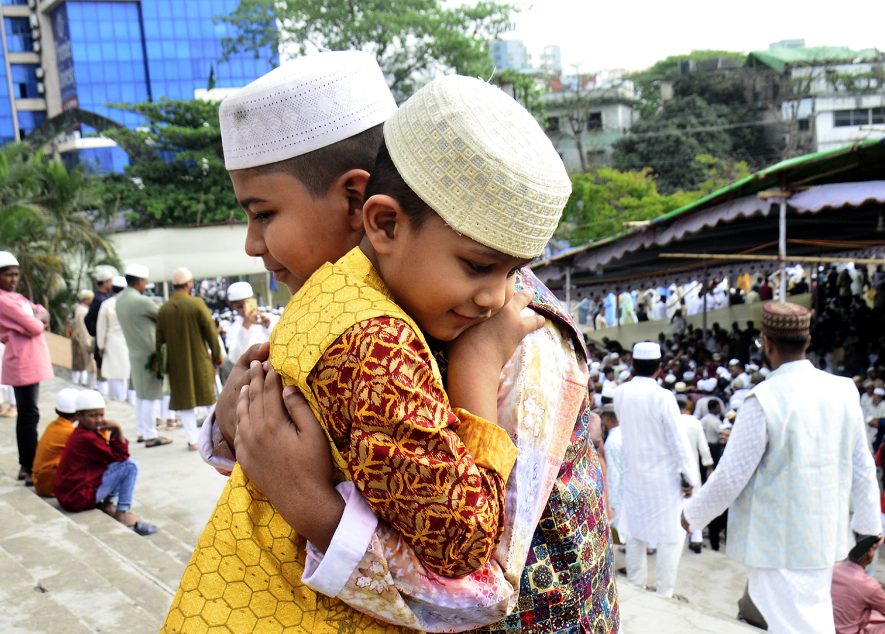 নামাজ শেষে কোলাকুলি করছে শিশুরা।
