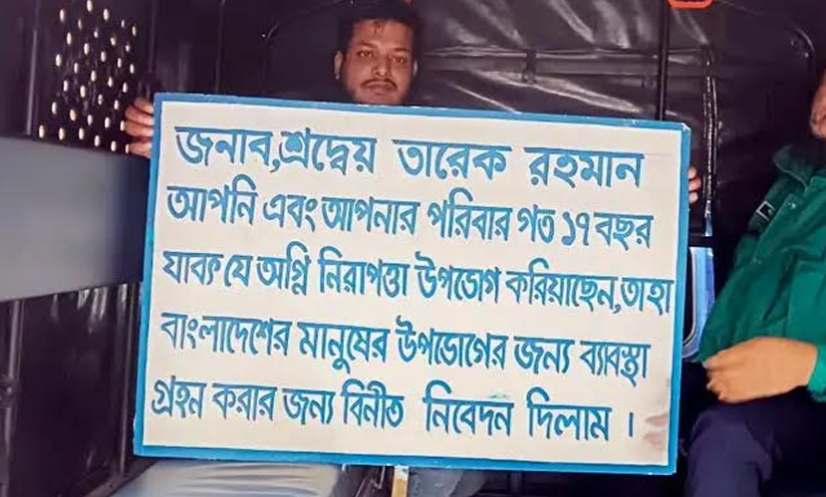 তার প্ল্যাকার্ডে লেখা ছিল, ‘জনাব, শ্রদ্ধেয় তারেক রহমান আপনি এবং আপনার পরিবার গত ১৭ বছর যাবত যে অগ্নি নিরাপত্তা উপভোগ করেছেন, তা বাংলাদেশের মানুষের উপভোগের জন্য ব্যবস্থা নেওয়ার জন্য বিনীত নিবেদন দিলাম।’