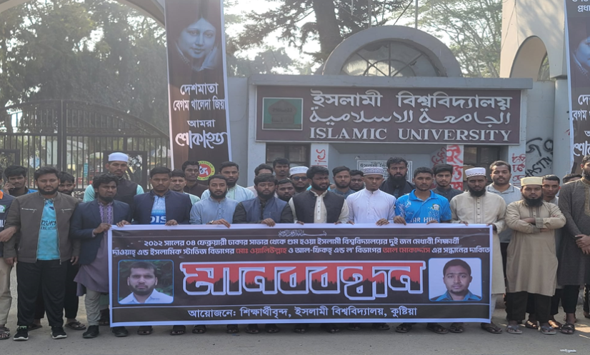 ইবি: চৌদ্দ বছর আগে ২০১২ সালে ৪ ফেব্রুয়ারি রাজধানীর সাভার থেকে গুম হওয়া ইসলামী বিশ্ববিদ্যালয়ের (ইবি) ‘দা’ওয়া অ্যান্ড ইসলামিক স্টাডিজ’ বিভাগের শিক্ষার্থী ওয়ালিউল্লাহ এবং ‘আল-ফিকহ অ্যান্ড লিগ্যাল স্টাডিজ’ বিভাগের আল-মুকাদ্দাসের সন্ধানের দাবিতে মানববন্ধন করেছে বিশ্ববিদ্যালয়টির শিক্ষার্থীরা।
