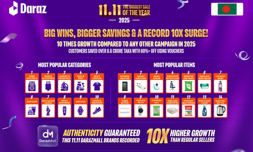 ২০২৫ সালের অন্য যেকোনো ক্যাম্পেইনের তুলনায় এবারের ১১.১১-তে ১০ গুণ প্রবৃদ্ধি অর্জিত হয়েছে। লাখো গ্রাহকের স্বতঃস্ফূর্ত অংশগ্রহণে মুখর ছিল এই আয়োজন, যেখানে আকর্ষণীয় ডিল এবং এক্সক্লুসিভ ভাউচারের মাধ্যমে ৬.৬ কোটি টাকারও বেশি সাশ্রয় হয়েছে। এর মূল চালিকাশক্তি ছিল অথেনটিক পণ্যের নিশ্চয়তা প্রদানকারী চ্যানেল ‘দারাজমল’, যা সাধারণ বিক্রেতার তুলনায় ১০ গুণ বেশি বিক্রয় অর্জন করেছে।