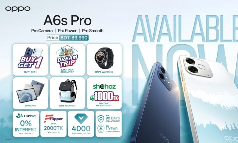 এ ছাড়াও, সহজ-এর সহযোগিতায় অপো এ৬এস প্রো ক্রেতাদের জন্য বিশেষ ভ্রমণ সুবিধা রয়েছে। ২৫০ জন ভাগ্যবান ক্রেতা ১,০০০ টাকার বাস টিকিট ভাউচার কোড পাবেন, যা সহজ প্ল্যাটফর্মে ব্যবহার করা যাবে। দেশীয় ও আন্তর্জাতিক বিমান টিকিটে সর্বোচ্চ ৬% ভাউচার সুবিধা উপভোগ করতে পারবেন। বিস্তারিত: oppo.com/bd/।