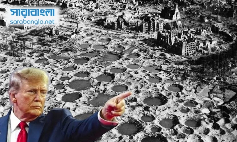 ১৯৪৫ সালে মিত্রবাহিনীর কার্পেট বোমা হামলায় জার্মানির ওয়েসেল ৯৭ শতাংশ ধ্বংস হয়ে যাওয়া ছবির সঙ্গে মার্কিন প্রেসিডেন্ট ডোনাল্ট ট্রাম্প।