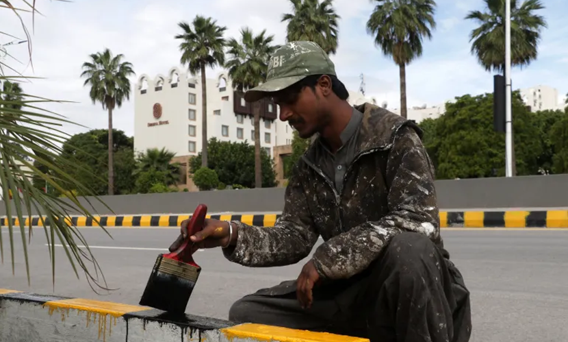 সেরেনা হোটেলের সামনে একজন শ্রমিক রাস্তায় রং করছেন। ছবি: আল জাজিরা