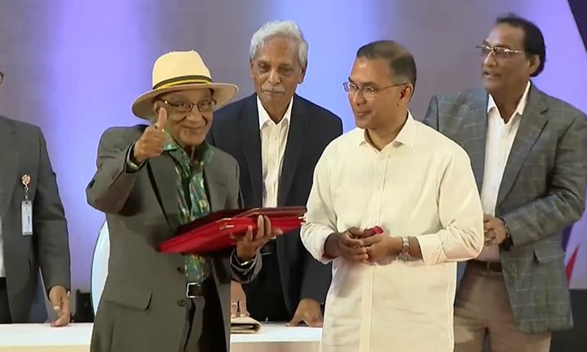 প্রধানমন্ত্রীর হাত থেকে একুশে পদক নিচ্ছেন বর্ষীয়ান সাংবাদিক শফিক রেহমান।