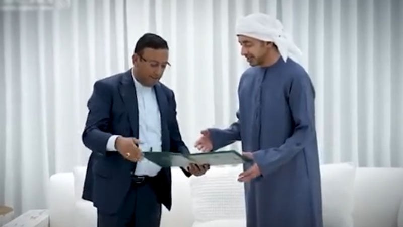 বাংলাদেশের প্রধানমন্ত্রীর পররাষ্ট্র বিষয়ক উপদেষ্টা হুমায়ুন কবিরের সঙ্গে সাক্ষাৎ করার সময় সংযুক্ত আরব আমিরাতের উপ-প্রধানমন্ত্রী ও পররাষ্ট্রমন্ত্রী শেখ আবদুল্লাহ বিন জায়েদ আল নাহিয়ান বার্তাটি গ্রহণ করেন।