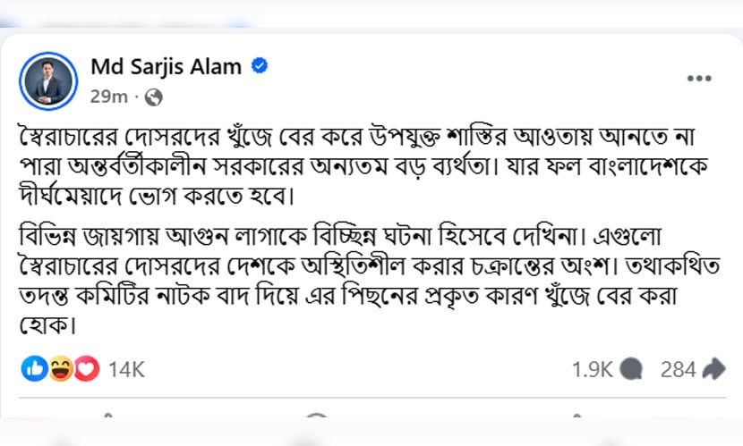 তিনি লেখেন, ‘স্বৈরাচারের দোসরদের খুঁজে বের করে উপযুক্ত শাস্তির আওতায় আনতে না পারা অন্তর্বর্তীকালীন সরকারের অন্যতম বড় ব্যর্থতা। যার ফল বাংলাদেশকে দীর্ঘমেয়াদে ভোগ করতে হবে। বিভিন্ন জায়গায় আগুন লাগাকে বিচ্ছিন্ন ঘটনা হিসেবে দেখিনা। এগুলো স্বৈরাচারের দোসরদের দেশকে অস্থিতিশীল করার চক্রান্তের অংশ। তথাকথিত তদন্ত কমিটির নাটক বাদ দিয়ে এর পিছনের প্রকৃত কারণ খুঁজে বের করা হোক।’
