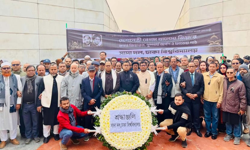 ঢাকা: শহিদ প্রেসিডেন্ট জিয়াউর রহমান এবং সাবেক প্রধানমন্ত্রী বেগম খালেদা জিয়ার কবর জিয়ারত, পুষ্পার্ঘ অর্পণ ও ফাতেহা পাঠ করেছে বাংলাদেশি জাতীয়তাবাদে বিশ্বাসী ঢাকা বিশ্ববিদ্যালয়ের শিক্ষকদের সংগঠন (ঢাবি) সাদা দল।