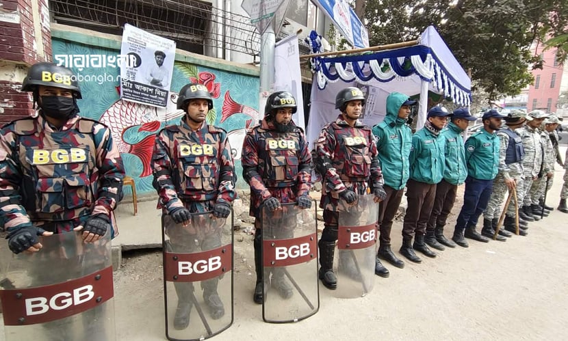 ক্যাম্পাসে বিপুল সংখ্যক আইনশৃঙ্খলা বাহিনীর সদস্য মোতায়েন করা হয়েছে। ছবি: সারাবাংলা