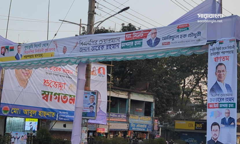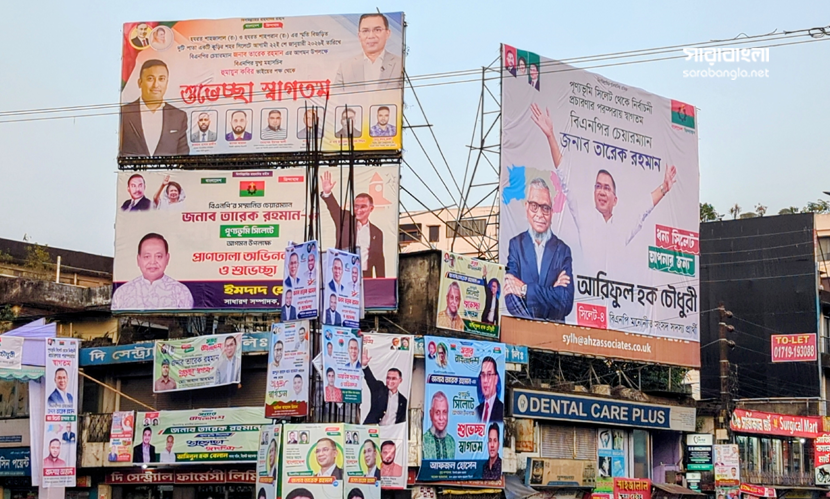 মোড়ে মোড়ে তারেক রহমান ও সিলেট বিএনপির নেতাদের ছবি সম্বলিত বিলবোর্ড, ব্যানার ফেস্টুন শোভা পাচ্ছে।। ছবি: সারাবাংলা