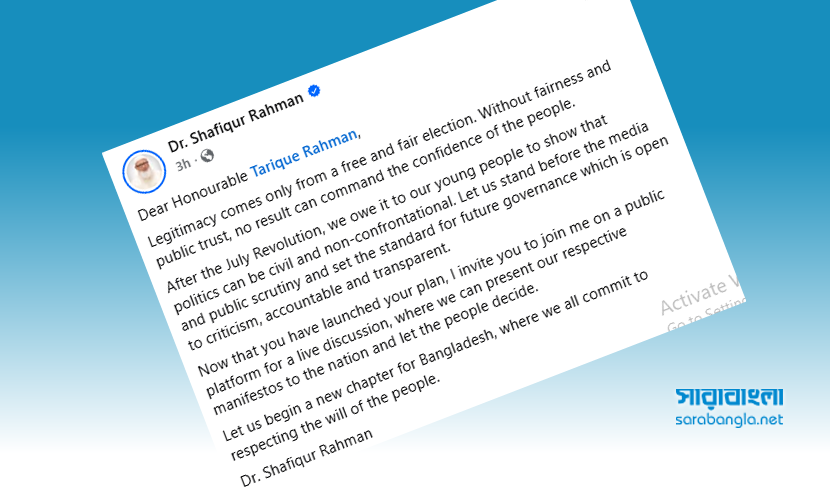 তিনি আরও লিখেছেন, ‘আপনি যেহেতু আপনার পরিকল্পনা ঘোষণা করেছেন, তাই আমি আপনাকে একটি উন্মুক্ত মঞ্চে সরাসরি আলোচনায় অংশগ্রহণের আমন্ত্রণ জানাচ্ছি। যেখানে আমরা জাতির সামনে নিজ নিজ ইশতেহার উপস্থাপন করব এবং জনগণই সিদ্ধান্ত নেবে।’