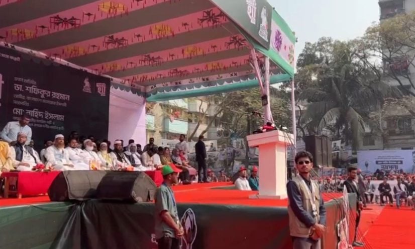 ঢাকা: রাজধানীর বাড্ডায় ঢাকা-১১ আসনের ১১ দলীয় নির্বাচনি ঐক্যের প্রার্থী জাতীয় নাগরিক পার্টির (এনসিপি) আহ্বায়ক নাহিদ ইসলামের নির্বাচনি জনসভায় যোগ দিয়েছেন বাংলাদেশ জামায়াতে ইসলামীর আমির ডা. শফিকুর রহমান ও বাংলাদেশ খেলাফত মজলিসের আমির মাওলানা মামুনুল হকসহ ১১দলের সিনিয়র নেতারা।