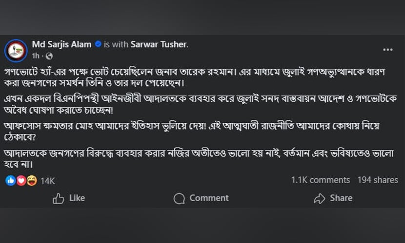 মঙ্গলবার (৩ মার্চ) এক ফেসবুক পোস্টে তিনি অভিযোগ করেন যে, একদল বিএনপিপন্থী আইনজীবী আদালতকে ব্যবহার করে জুলাই সনদ ও গণভোটকে অবৈধ ঘোষণা করার চেষ্টা করছেন, যা মূলত ক্ষমতার মোহে ইতিহাসকে অস্বীকার করার শামিল।