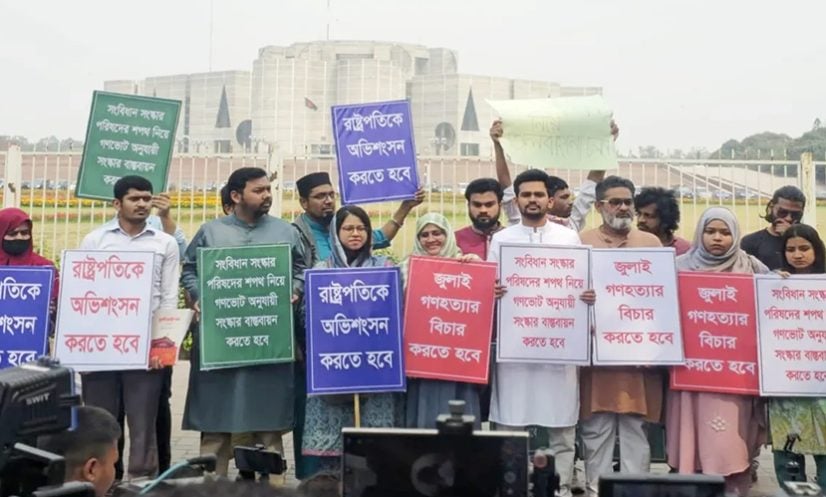 প্লেকার্ডে লেখা রয়েছে রাষ্ট্রপতিকে অভিশংসন করতে হবে। সংবিধান সংস্কার পরিষদে শপথ নিয়ে গণভোট অনুযায়ী সংস্কার বাস্তবায়ন করতে হবে।