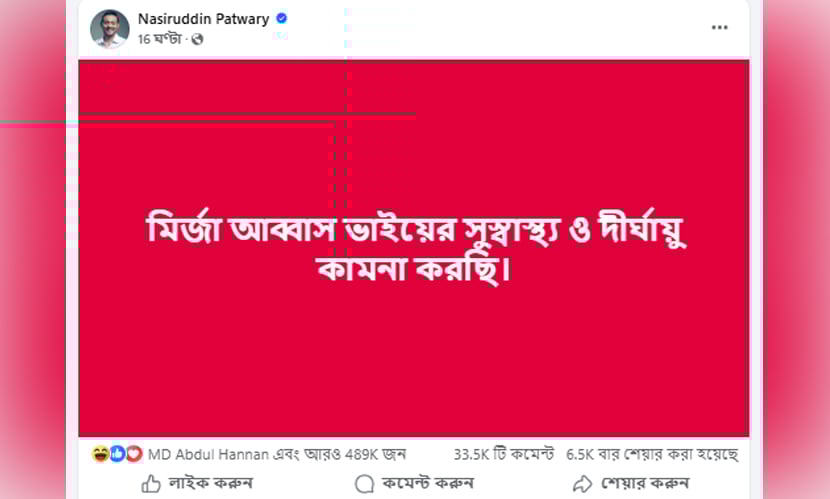 বৃহস্পতিবার (১২ মার্চ) রাত পৌনে ৮টার দিকে নিজ ভেরিফায়েড ফেসবুক আইডিতে এক পোস্টে তিনি লিখেন, ‘মির্জা আব্বাসের সুস্বাস্থ্য ও দীর্ঘায়ু কামনা করছি।’