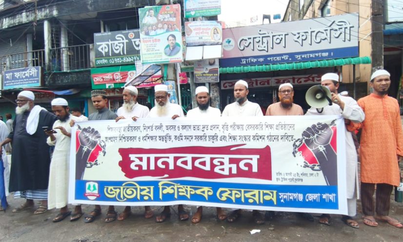 শনিবার (২ আগস্ট) দুপুরে শহরের ট্রাফিক পয়েন্টে জাতীয় শিক্ষক ফোরাম সুনামগঞ্জ জেলা শাখা এই মানববন্ধনের আয়োজন করে।