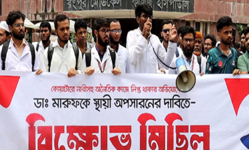 রংপুর: নারীর সঙ্গে আপত্তিকর অবস্থায় পুলিশের কাছে আটক রংপুর মেডিকেল কলেজের চিকিৎসক ও বিএনপিপন্থী পেশাজীবী সংগঠন ডক্টরস অ্যাসোসিয়েশন অব বাংলাদেশ-কমিটির সাংগঠনিক সম্পাদক ডা. এ বি এম মারুফুল হাসানের অপসারণ ও শাস্তির দাবি জানিয়েছে মেডিকেল শিক্ষার্থী ও স্থানীয়রা।