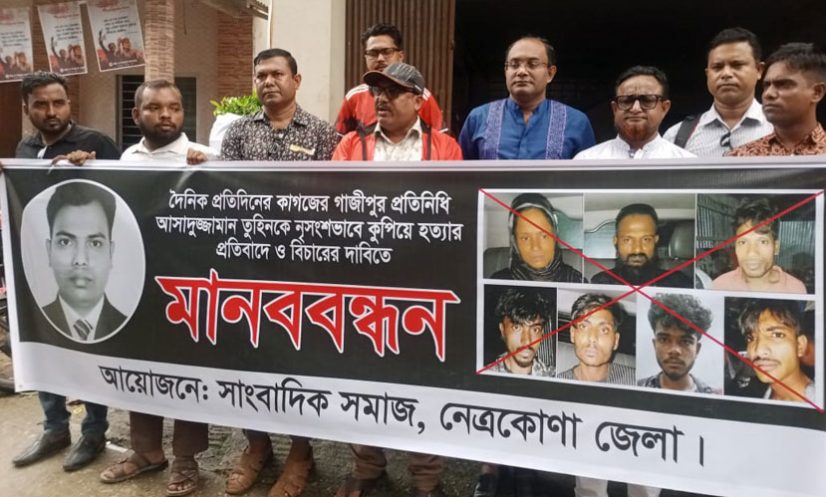 নেত্রকোনা: গাজীপুরে দৈনিক প্রতিদিনের কাগজ পত্রিকার প্রতিনিধি আসাদুজ্জামান তুহিনকে কুপিয়ে হত্যার প্রতিবাদে ও জড়িতদের দ্রুত বিচারের দাবিতে নেত্রকোনায় স্থানীয় সাংবাদিকদের এক মানববন্ধন অনুষ্ঠিত হয়েছে।