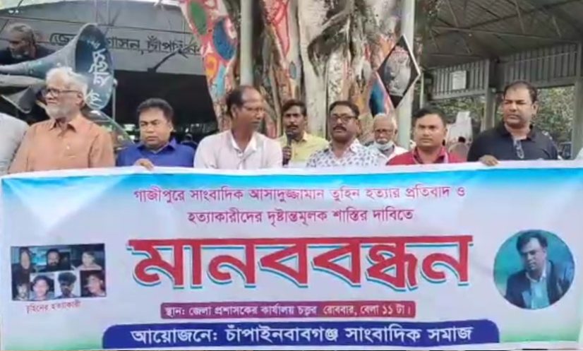 চাঁপাইনবাবগঞ্জ: গাজীপুরে সাংবাদিক আসাদুজ্জামান তুহিন হত্যার প্রতিবাদে এবং হত্যাকারীদের দ্রুত গ্রেপ্তার ও দৃষ্টান্তমূলক শাস্তির দাবিতে চাঁপাইনবাবগঞ্জে মানববন্ধন অনুষ্ঠিত হয়েছে।