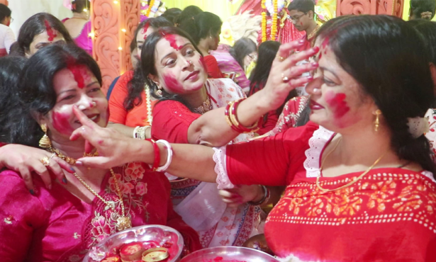 সকালে ঢাকার বিভিন্ন পূজামণ্ডপে ভিড় জমতে শুরু করে। প্রতিমার সামনে ভক্তিমুখর প্রার্থনার পরই শুরু হয় সিঁদুরের উচ্ছ্বাস। কারো শাড়ির আঁচল, কারো চুলের গোছা, আবার কারো মুখমণ্ডল ভরে ওঠে লাল রঙে। একে অপরকে আলিঙ্গন করে নারীরা বলেন ‘শুভ বিজয়া’, আর সিঁদুরের রঙে মিলেমিশে যায় হাসি-কান্না।