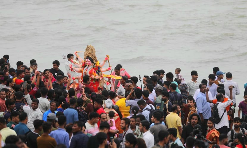 হালকা বৃষ্টিসহ বিরূপ আবহাওয়ার মধ্যে ভক্তদের ঢল নামে পতেঙ্গায়। সেনাবাহিনী ও পুলিশ-র্যাবের কঠোর নিরাপত্তার মধ্যে দুপুর থেকে শুরু হয় প্রতিমা নিরঞ্জনের পালা। ট্রাকে করে দেবী দুর্গার প্রতিমা নিরঞ্জনের জন্য নিয়ে যাওয়া হয় পতেঙ্গা সমুদ্র সৈকতে। সেখানে বিসর্জন কার্যক্রম তদারক করেন নগর পুলিশ কমিশনার হাসিব আজিজ।