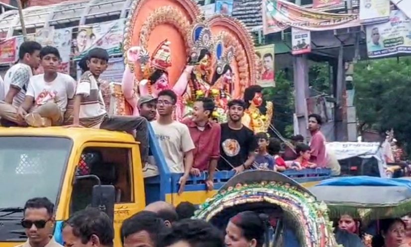 বৃহস্পতিবার (২ অক্টোবর) দুপুরের পর থেকেই ঢাকা বিশ্ববিদ্যালয়ের পলাশীর মোড় এলাকায় জড়ো হতে থাকে নগরের বিভিন্ন প্রান্ত থেকে আসা পূজা কমিটির ট্রাক। প্রতিমা সাজিয়ে নিয়ে আসেন ভক্তরা। বিকাল পৌনে ৪টার দিকে পলাশীর মোড় থেকে শোভাযাত্রা যাত্রা শুরু করে সদরঘাটের উদ্দেশে।