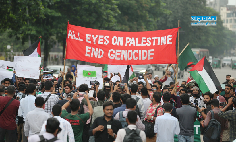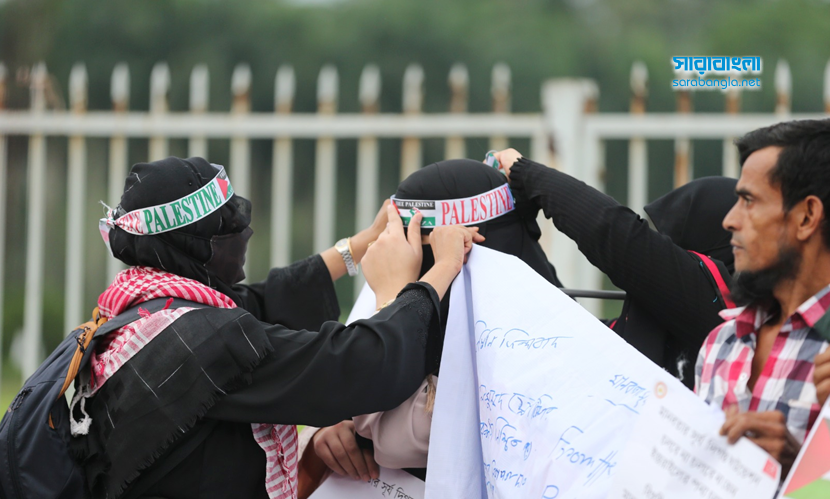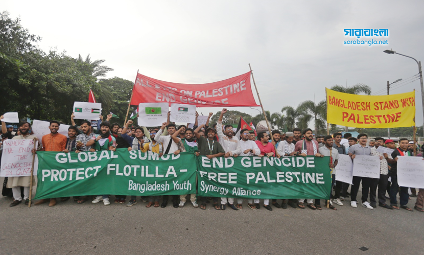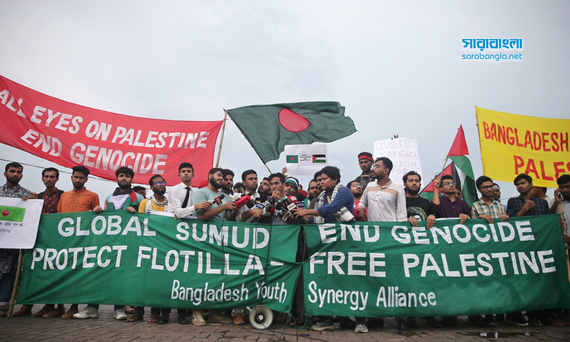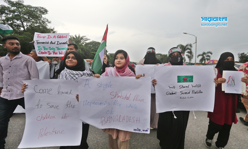 গ্লোবাল সুমুদ ফ্লোটিলা ইসরায়েলের নৌ অবরোধ ভেঙে সমুদ্রপথে গাজায় ত্রাণ নিয়ে যাওয়ার একটি বৈশ্বিক প্রচেষ্টা। এই নৌবহরে ৪০ টির বেশি বেসামরিক নৌযান ছিল, যার সবকটিই আটক করেছে ইসরায়েল। একইসঙ্গে নৌযানে থাকা বিভিন্ন দেশের নাগরিকদের বেশিরভাগকে আটক করেছে দখলদার বাহিনী। এর প্রতিবাদে বিক্ষোভ করেছে বাংলাদেশ ইয়ুথ সিনার্জি অ্যালায়েন্স। তাদের সঙ্গে পরিবেশ, জলবায়ু, মানবাধিকার, সামাজিক, সাংস্কৃতিক, ক্রীড়া ও শিক্ষা এবং স্বেচ্ছাসেবীসহ প্রায় ৭০টি সংগঠনের প্রতিনিধিরা সংহতি প্রকাশ করে অংশ নেন। শুক্রবার (৩ অক্টোবর) বিকেলে ঢাকার মানিক মিয়া এভিনিউ-এ জাতীয় সংসদ ভবনের সামনে অনুষ্ঠিত বিক্ষোভের ছবিগুলো ফ্রেমবন্দি করেছেন সারাবাংলার সিনিয়র ফটোকরেসপন্ডেন্ট হাবিবুর রহমান।
